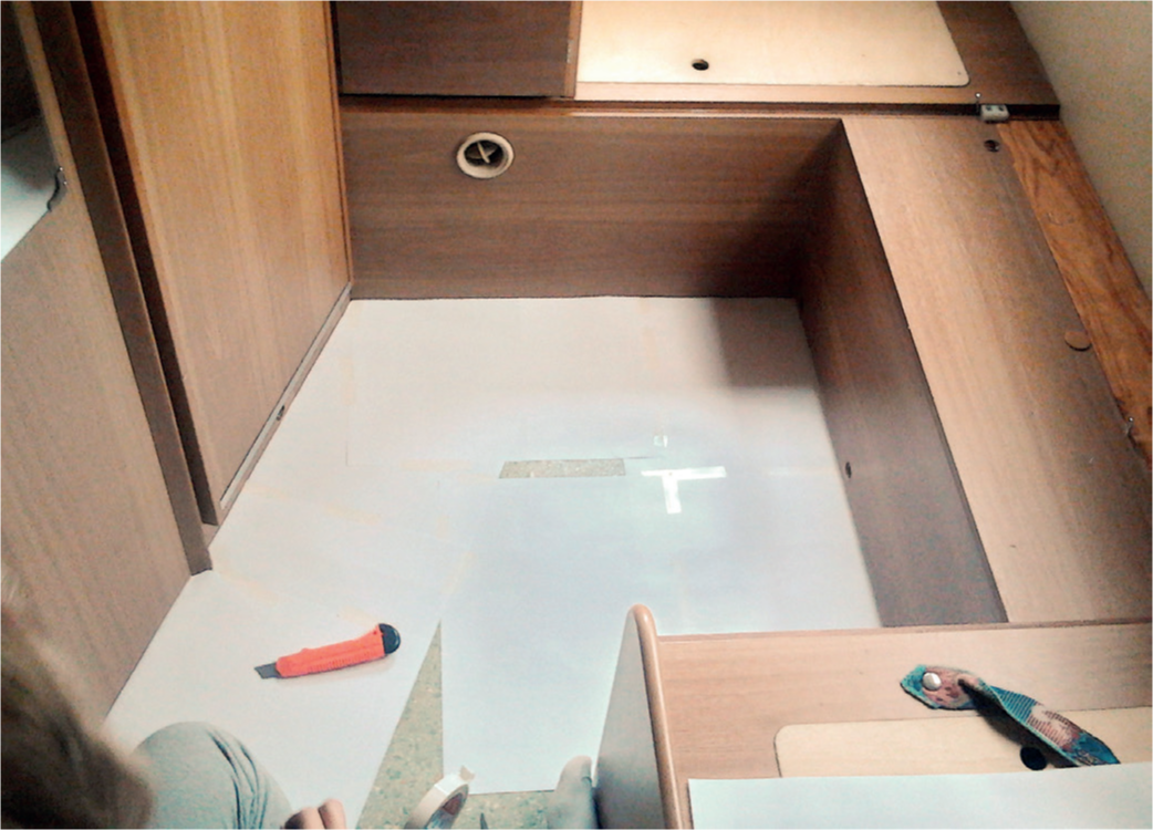 Al termine abbiamo riposizionato il linoleum cosi sagomato sul pavimento del camper finendo così il lavoro: il risultato è stato davvero soddisfacente e i costi molto ridotti, pur se ovviamente un po' di fatica c’è stata!