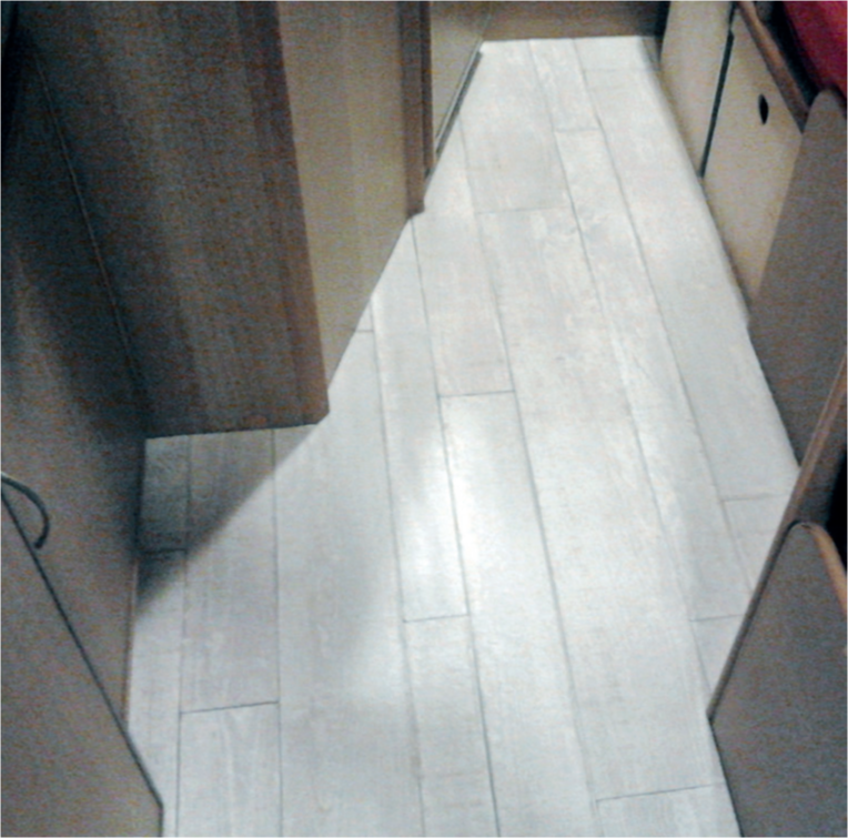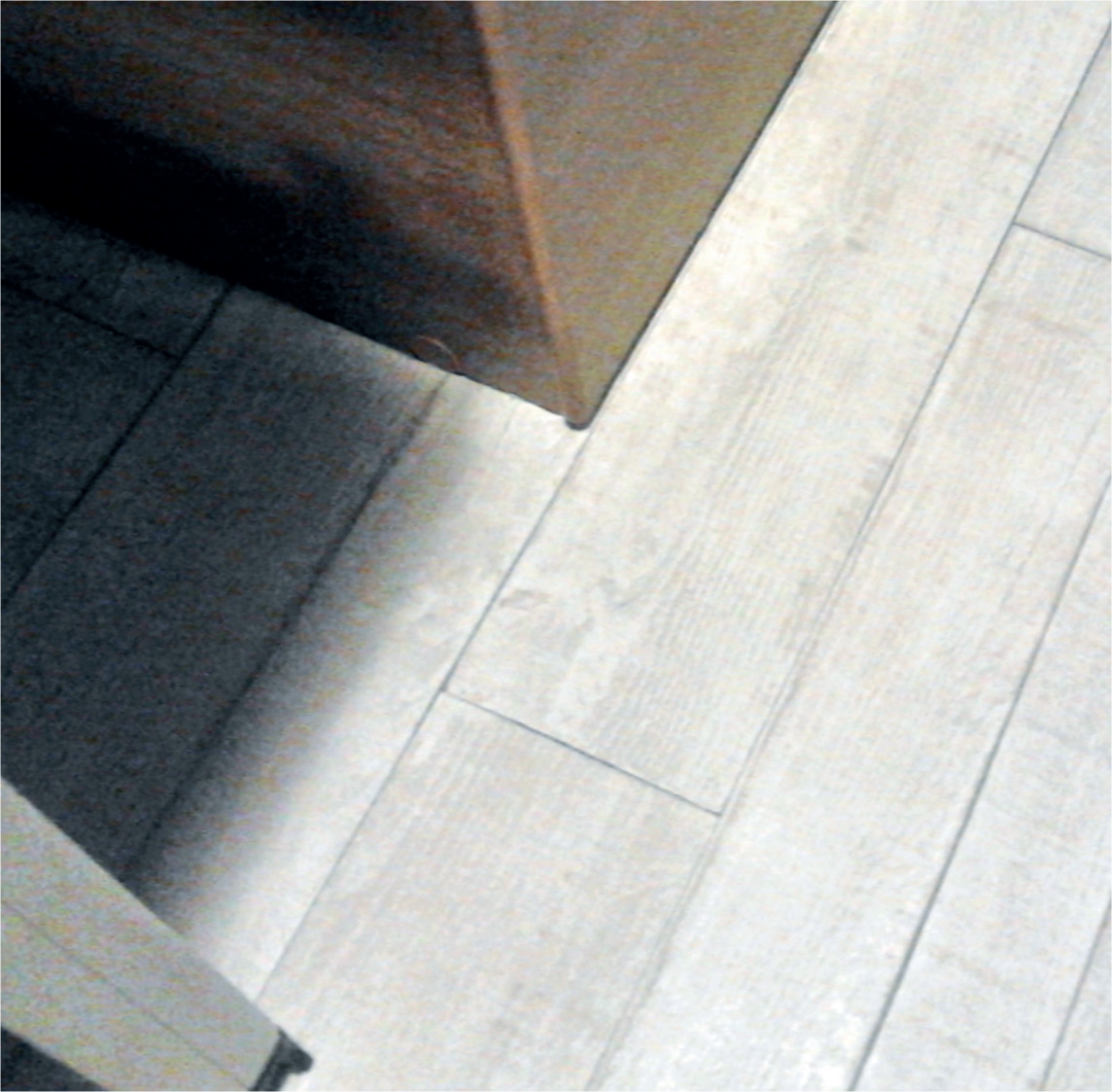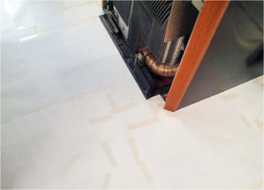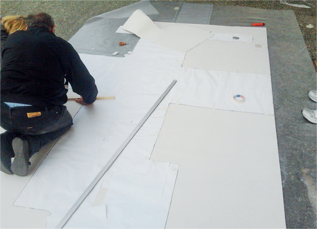 Dopo lo smontaggio dei regoli abbiamo proceduto a creare una dima in pezzo unico del pavimento seguendo tutto il perimetro dello stesso con della carta con spessore di 2 mm, con forbici, taglierino, scotch e tanta pazienza