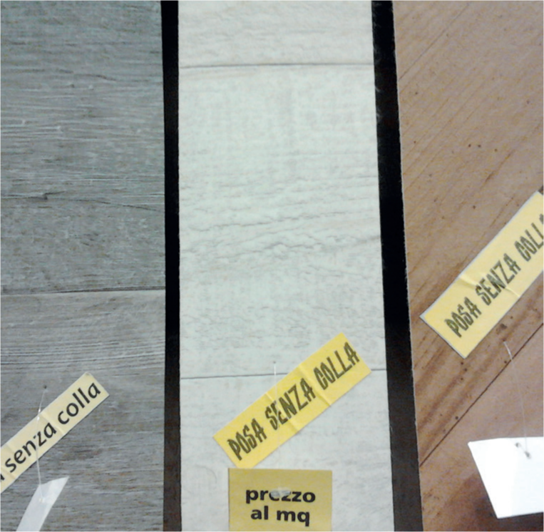 Il pavimento in PVC denominato "playa white" con spessore di 2 mm, venduto in bobine di altezza 2 mt. Le caratteristiche di questo materiale sono: posa senza colla, ignifugo classe 1, ottima capacità di isolamento termico e acustico. Prezzo 12,90 euro al mq comprato al Leroy Merlin.