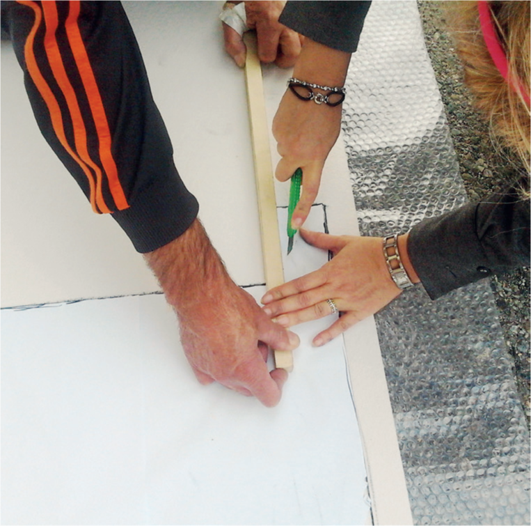 Quindi abbiamo eseguito il taglio con un semplice cutter, all’esterno del camper, seguendo con attenzione i profili della dima creata,