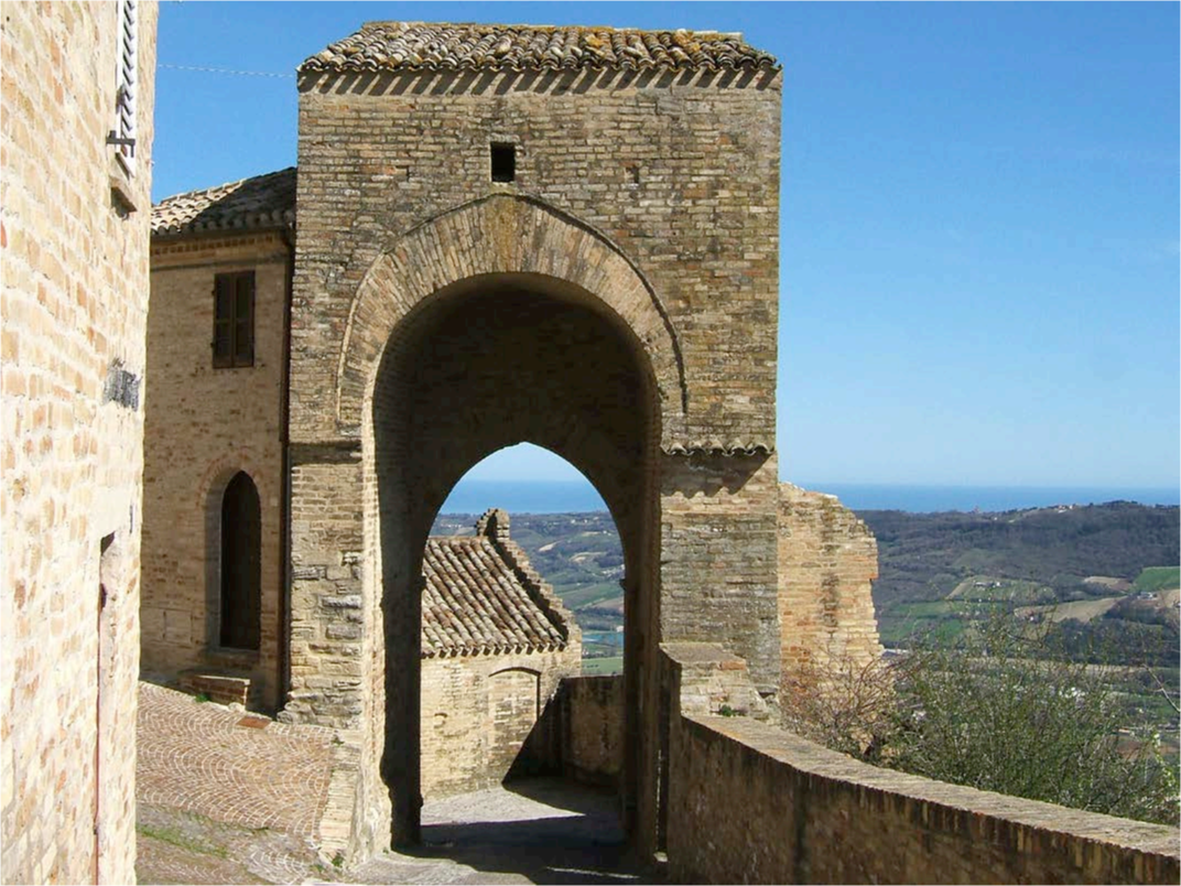 Il primo incontro con uno dei tanti e affascinanti borghi marchigiani è a Torre San Patrizio, alle spalle del mare. Il minuto borgo conserva l’impronta del periodo medievale e resti delle fortificazioni tre-quattrocentesche. Intatta è la Porta del Sole, con arco gotico, anticamente l’unico accesso all’abitato. Una via principale e brevi vie acciottolate attraversano il borgo dalla forma affusolata. Quando le alte case a schiera si aprono in un varco, si ammira un vasto panorama sul mare, sulla campagna tutto intorno e sugli Appennini. Le grandiose vedute saranno una costante di tutto questo viaggio. Lasciato Torre San Patrizio, dopo pochi chilometri ci attende Rapagnano. Il nucleo storico ha forma ovoidale e le caratteristiche di castello medievale sono evidenti nei resti delle mura fortificate, nei torrioni merlati e nelle porte d’accesso. Cuore del borgo è piazza Sicconi, su cui si affacciano il Palazzo Comunale, la Chiesa di S. Antonio e la Chiesa del Suffragio. Sul fondo della piazza si erge a sentinella il bianco Monumento ai Caduti. Continuando a scendere verso la strada di fondovalle, ecco Magliano di Tenna. Secondo una leggenda, fu un capitano di ventura di nome Malleano/Mayano a fondare il castello intorno l’anno 1000. Anticamente, la struttura fortificata vantava sei torri, ora ne restano due, di cui una esagonale, inglobate nella cerchia delle case. L’impianto è circolare e le mura trecentesche, le viuzze e le piazzette danno al borgo un’inconfondibile atmosfera medievale.