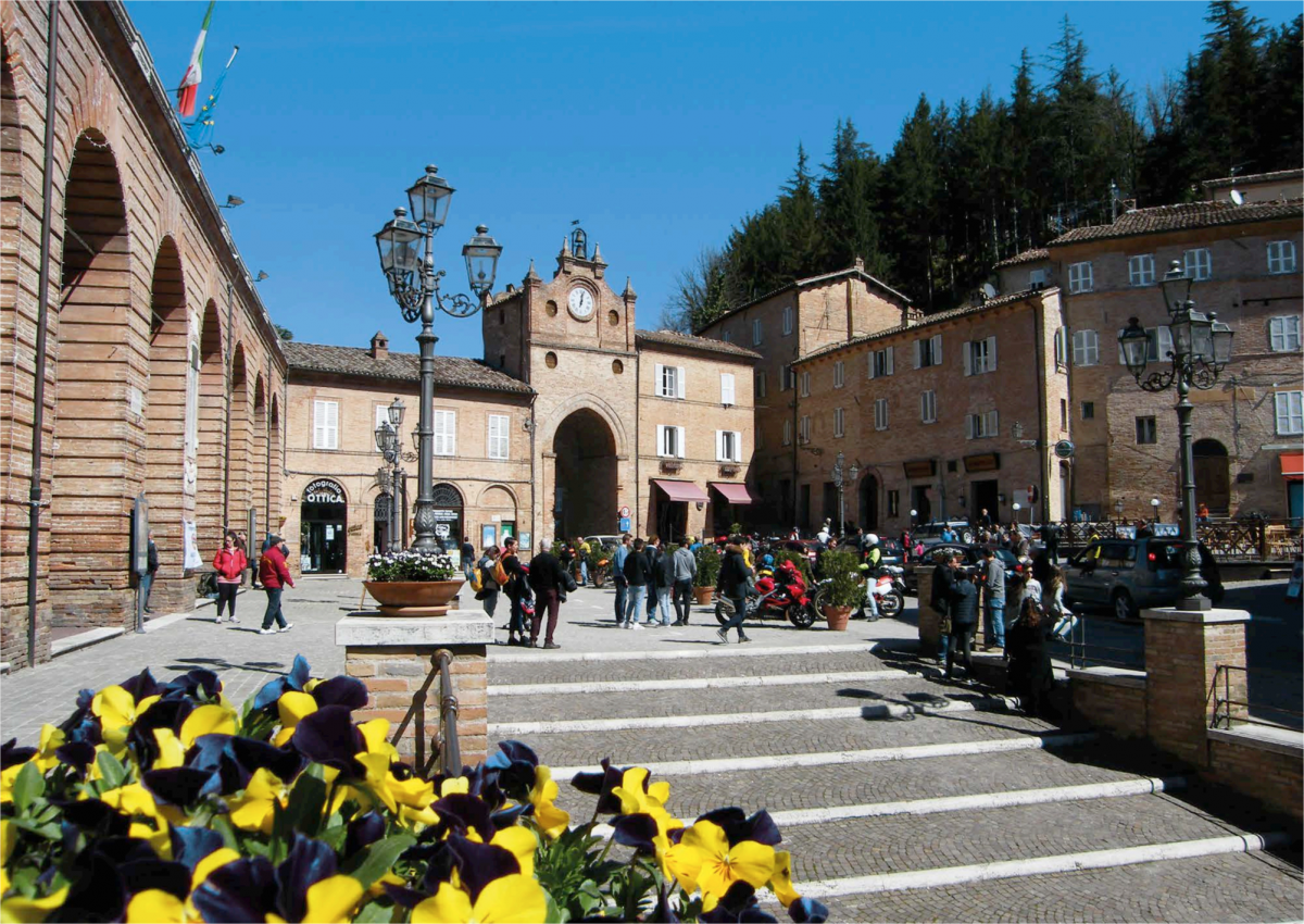 Ritornati sulla strada di fondovalle che costeggia il Tenna, si arriva in breve a Servigliano, incluso nell’elenco dei Borghi più belli d’Italia. Il nucleo storico è molto particolare, serrato in un severo quadrato cinto da mura, tagliato da due strade principali fra loro perpendicolari e tre porte d’accesso, senza fronzoli. A prima vista sembrerebbe l’impianto di un castro romano, accampamento militare segnato dagli assi viari del Cardo e del Decumano. In teoria lo è, ma in pratica no. Ciò che oggi si può ammirare è una ricostruzione risalente alla fine del 1700. In principio, in effetti, un insediamento romano c’è stato, però in posizione più elevata e distante rispetto all’attuale posizione. Sul finire del 1700 la collina su cui sorgeva l’abitato originario cominciò a franare e si decise quindi di ricostruirlo in piano, dove si trova ora, nei pressi del Convento dei Frati Minori Osservanti. In onore di Papa Clemente XIV, che permise la ricostruzione, assunse il nome di Castel Clementino ma poi, con l’unità d’Italia, riprese il nome di Servigliano. L’impianto urbanistico è quindi quadrangolare, compatto e armonico secondo canoni neoclassici, con la riproposizione del sistema viario romano di cardi e decumani. Nel 1915 fu costruito a Servigliano un grande campo di prigionia, tristemente utilizzato sia nella Prima sia nella Seconda guerra mondiale. Per questo sono nati il Parco della Pace e la Casa della Memoria (www.lacasadellamemoria.com), ospitata nella vecchia stazione ferroviaria. Da non dimenticare anche il tradizionale appuntamento dell’Infiorata del Corpus Domini, a giugno, uno splendido percorso floreale nel quadrato del centro storico che colora e profuma le schiette vie del borgo.