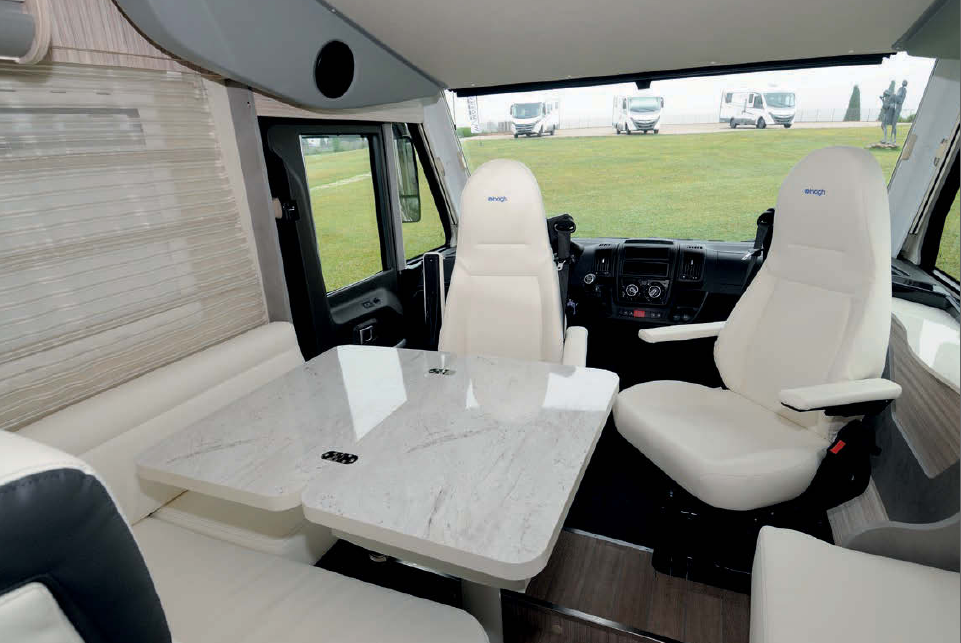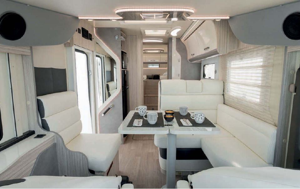 Luminoso e accogliente, il nuovo arredamento dai tenui colori chiari è abbellito da pensili con sportelli arcuati laccati panna, maniglie cromate e finiture in grigio chiaro. Impreziosisce ulteriormente l’interno l’accurata illuminazione ambiente totalmente a led. Il living può riunire comodamente intorno al pratico tavolo monogamba traslabile che si apre a libro, le cinque persone previste in base ai posti omologati. Quattro i posti frontemarcia con poggiatesta e cinture di sicurezza a tre punti., mentre l’eventuale quinto passeggero siede contromarcia nel divanetto laterale dotato di cintura addominale. Di serie la selleria in microfibra o in opzione, come visibile nelle foto, in ecopelle.