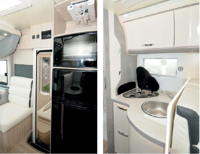Il piano cottura ad incasso ha tre fuochi con coperchio frangi fiamma e protezione sulla parete laterale ed è corredato da un ampio piano di lavoro e lavello circolare satinato inox con miscelatore. Utili i due ganci appenditutto a parete. Nella base ci sono due grandi cassetti - uno dei quali integra il cassetto portaposate - e un ampio cestello estraibile, mentre sopra la finestra c’è il pensile con luce di servizio. Oltre alla cappa aspirante, a tetto c’è un oblò disponibile in opzione con Turbovent. Di fronte al blocco cucina la colonna col frigorifero da 150 litri con sovrastante slitta porta TV. Tra gli optional, il forno a gas.