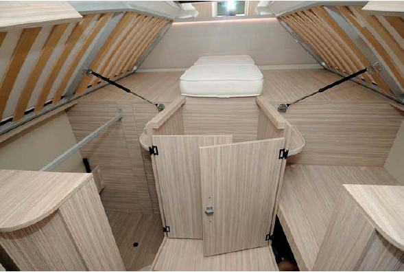 I due ampi letti gemelli (200x83 cm) si restringono leggermente ai piedi per dare più spazio ai due gradini di accesso centrali di cui uno con vano interno e ai due capienti armadi, facilmente agibili sia da sportelli sui fianchi, che sollevando le reti dei letti grazie a pistoni a gas. Sempre per lo stivaggio, il pensile con tre sportelli e mensole laterali che sovrasta la testiera con specchio e luci di lettura orientabili.
