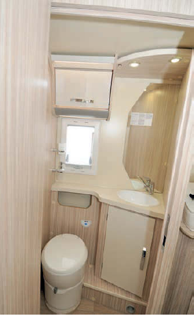 A soffitto spot led e aeratore fisso. Sull’altro lato il vano toilette con wc a tazza orientabile, mobile lavabo con specchio e vano con sportello nella base. A parete un pensile e la finestra opaca con oscurante e zanzariera. Completano la dotazione, l’ampio piano del mobile lavabo e accessori bagno a parete. Aprendo a 90° la porta della toilette è possibile isolare completamente la zona notte.